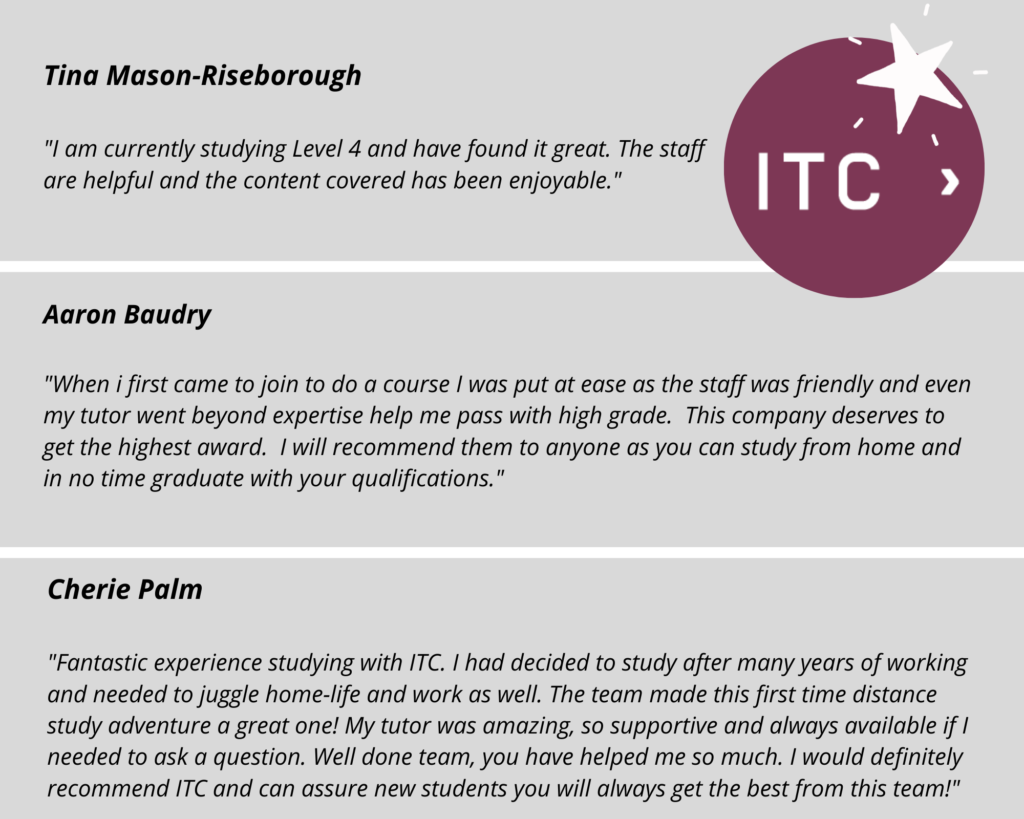 ITC Study From Home courses are specifically designed to appeal to the learning styles of all learners by using a wide variety of resources and activities.